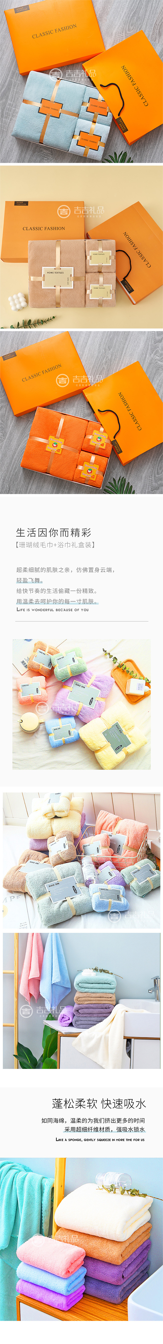 | 礼品外观颜色 | 浴巾毛巾颜色混搭,礼盒配经典爱马仕橙色 |