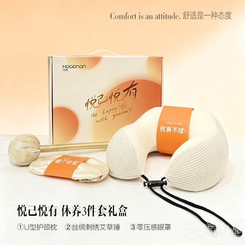 舒适是一种态度 悦己悦有休养三件套礼盒 U型护颈枕+丝绸刺绣艾草锤+零压感眼罩 手提彩盒装