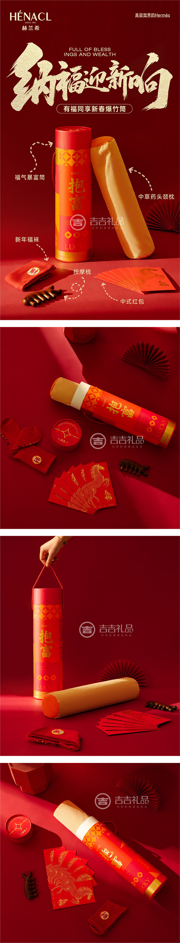 明细:福气暴富筒*1,中草药头颈枕*1,经络按摩梳*1,新年福袜*1双,中式红包*6个;