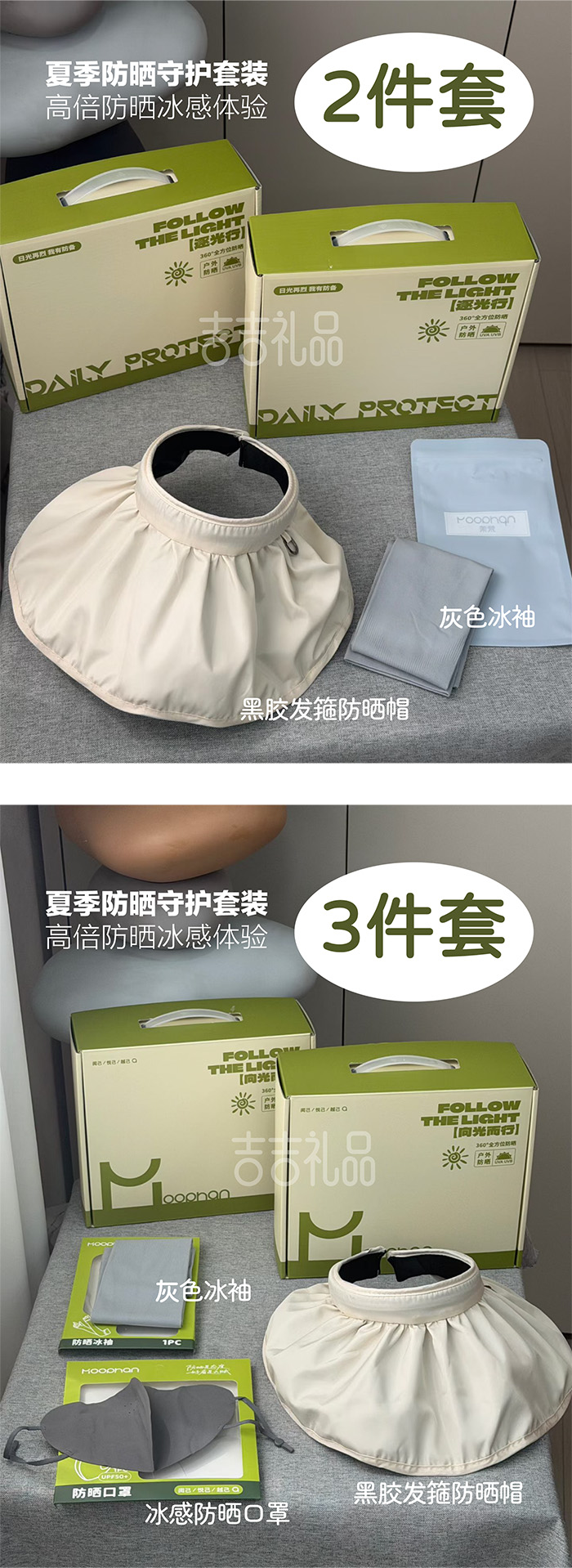 3件套(黑胶发箍防晒帽*1+灰色冰袖*1+冰感防晒UPF口罩*1):17元(20个/件)